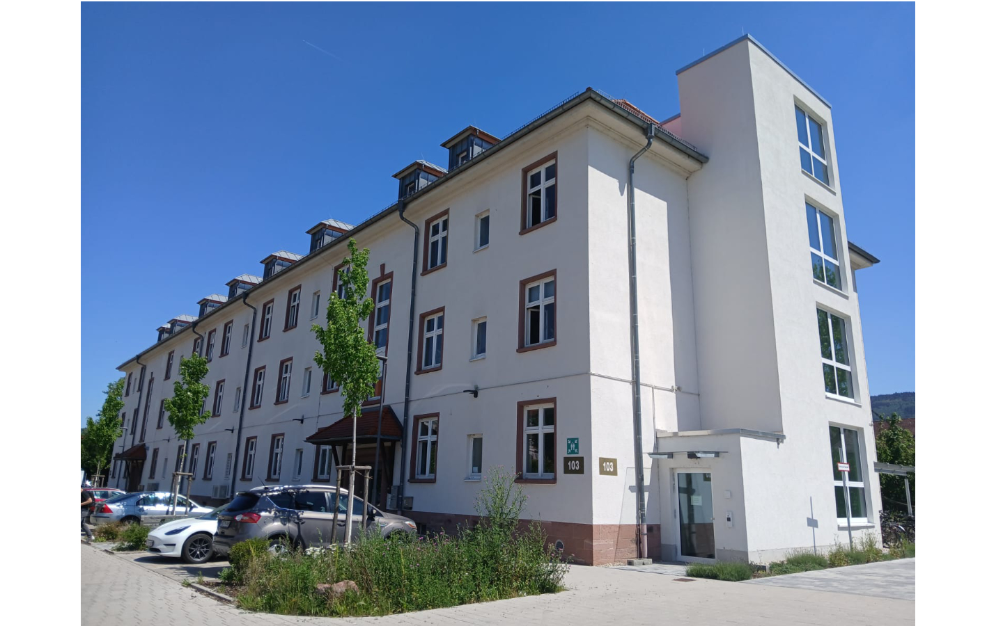 Auf dem ehemaligen Areal der US-Kaserne „Patton Barracks“ entstanden im Gebäude 103 neue Büroräumlichkeiten für eine digitale Zukunft. Die zuletzt als Flüchtlingsunterkunft genutzten Appartements wurden in kürzester Zeit modernisiert und zur Büronutzung umgerüstet, was neben sämtlichen Neubauaktivitäten zunächst auch umfangreiche Abbruch- und Entkernungsmaßnahmen erforderte. Das Gebäude verfügt nun über helle, freundliche Büroräume und hochmoderne Glasfaserverkabelung, was den Mietern ein effizientes und modernes Arbeiten ermöglicht.