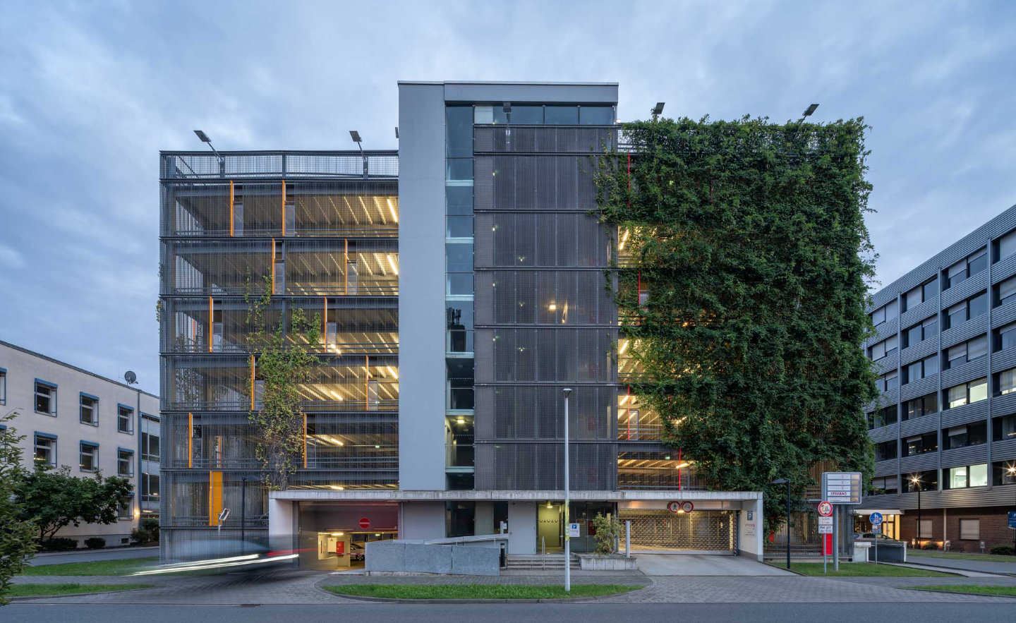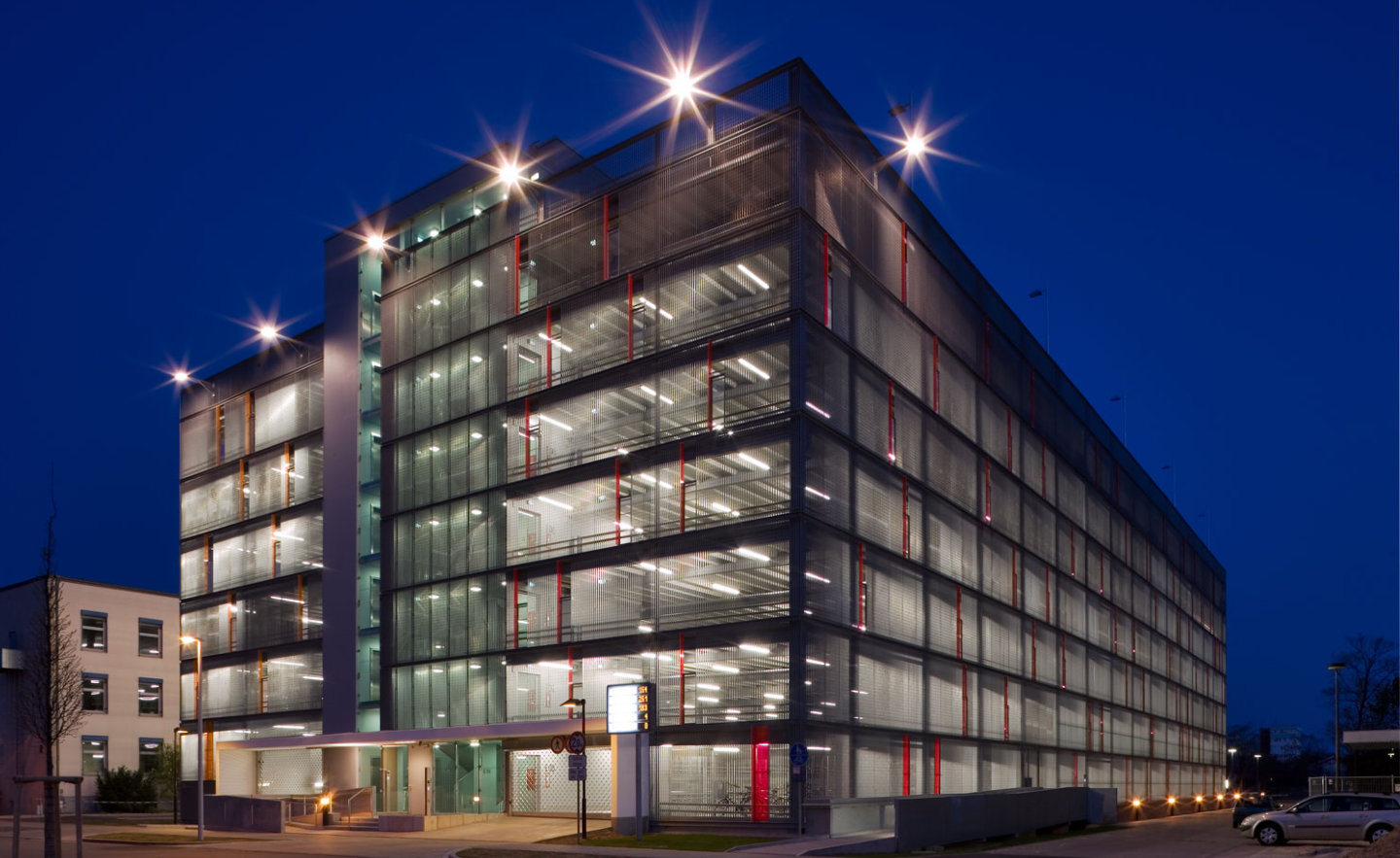 Auf seinen 14 Halbgeschossen inklusive Freideck finden bis zu 826 Fahrzeuge und bis zu 82 Fahrräder Platz.
